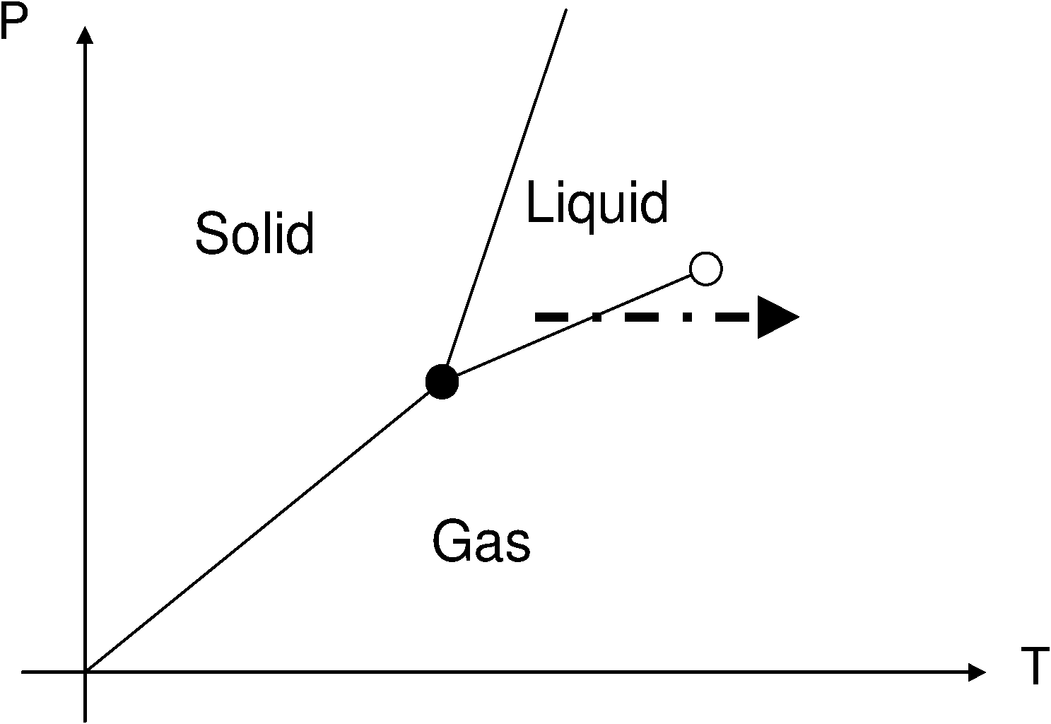 まず、等圧過程を考える。液体から粒子が可逆的に気化するためには、 その温度における飽和蒸気圧\(P_V\)で気化しなければならない。 圧力\(P_L\)の液体から、飽和蒸気圧\(P_V\)で体積\(V_V\)の気泡を作るための仕事\(W_1\)は \[W_1 = (P_V - P_L)V_V\] である。ここで、液体は準安定状態にあるため、飽和蒸気圧よりも液体の圧力の方が小さい(\(P_V>P_L\))。